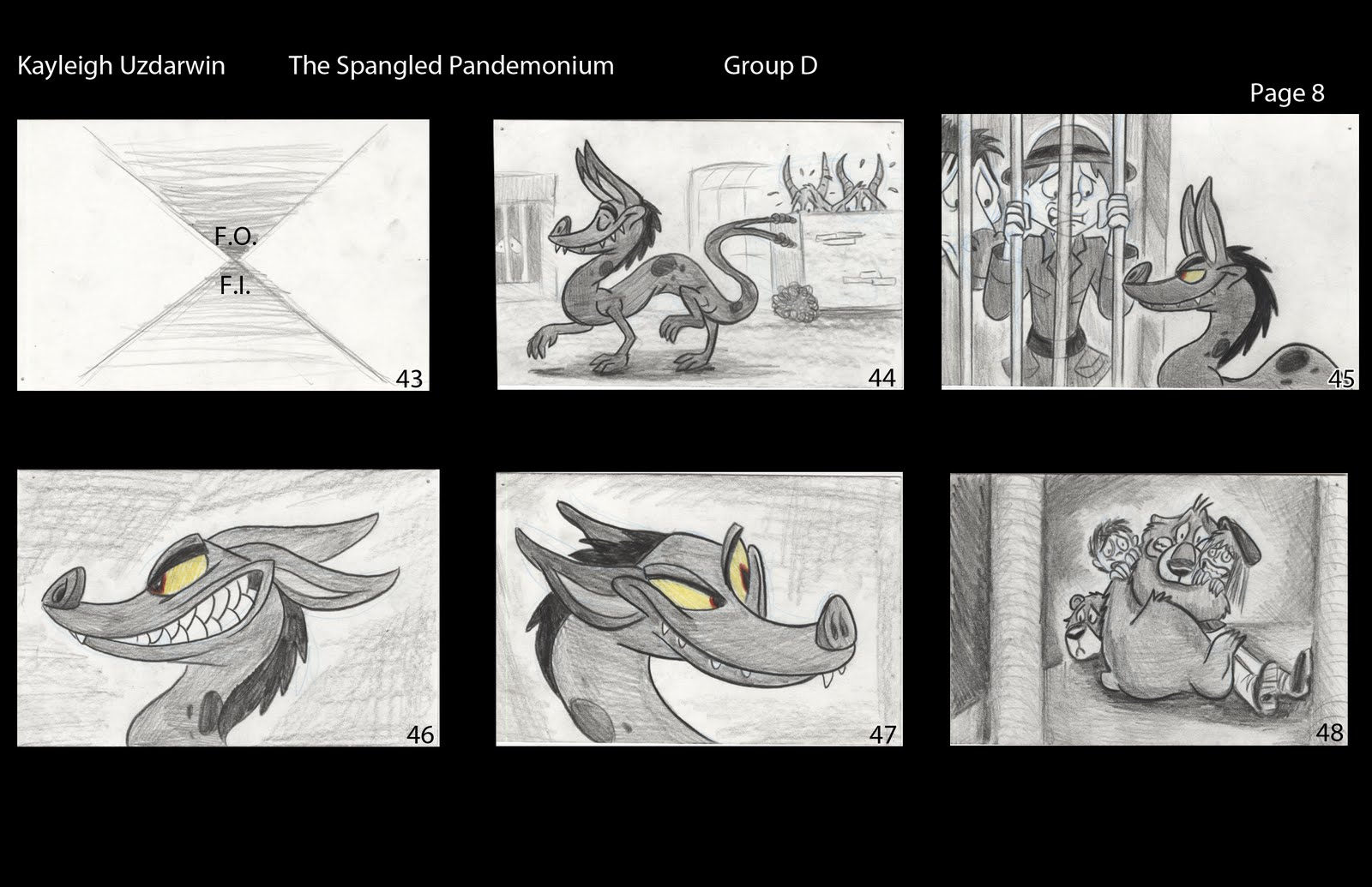 I really had fun with this. This storyboard was pinned up on the wall and another classmate had to be able to follow the story and pitch it, called a reverse pitch. If the classmate had trouble "reading it", then many things would have to be fixed for the final. The person who read mine had no problem following the story, and everyone got a laugh that I put cameos of me and my two friends drawing animals at the zoo, which made me happy haha. She even knew it was us (: My professor told me to edit a few things, like panels two and three should be angled to match panel four (I did that in Photoshop), and to add in panel twenty to show my other friend and I running off away from the creature, leaving my other friend behind to get eaten. "Don't worry Alex it's just a cartoon," my professor said.